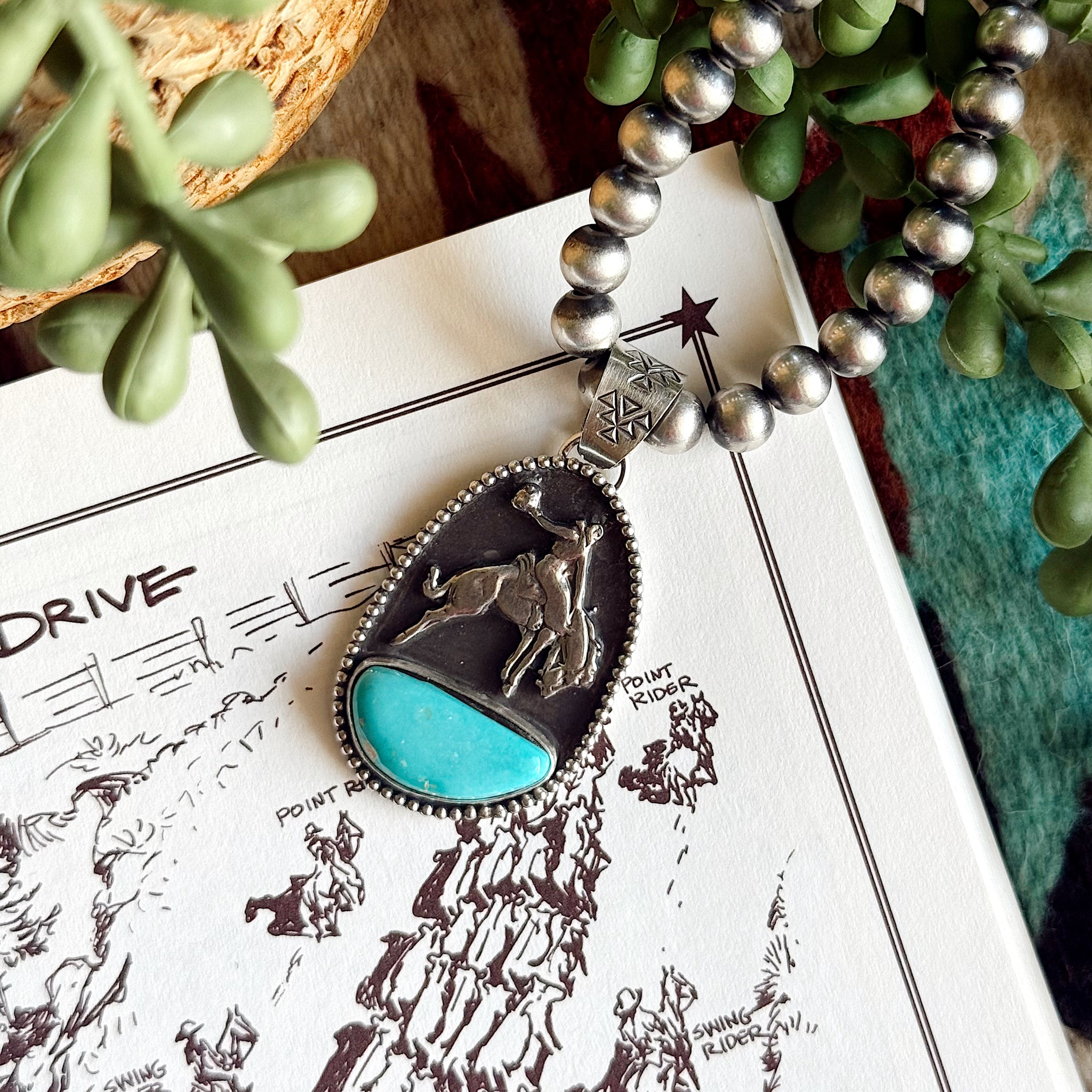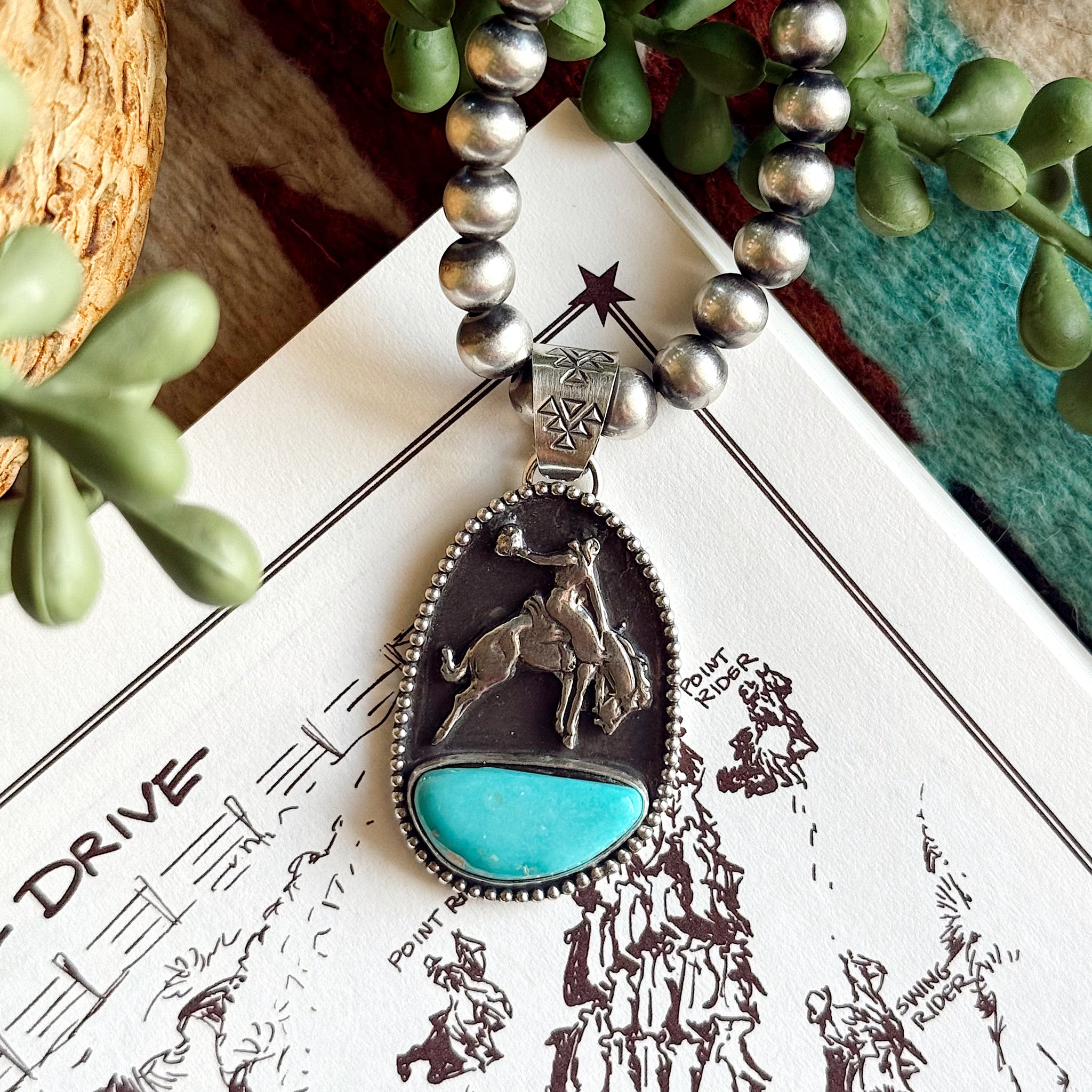 This bronc rider pendant features high-grade tyrone turquoise. Hand stamped bail fits up to 8mm navajo-style pearls. Stamped with my maker's mark C3 .925! Does not include machine made pearls.