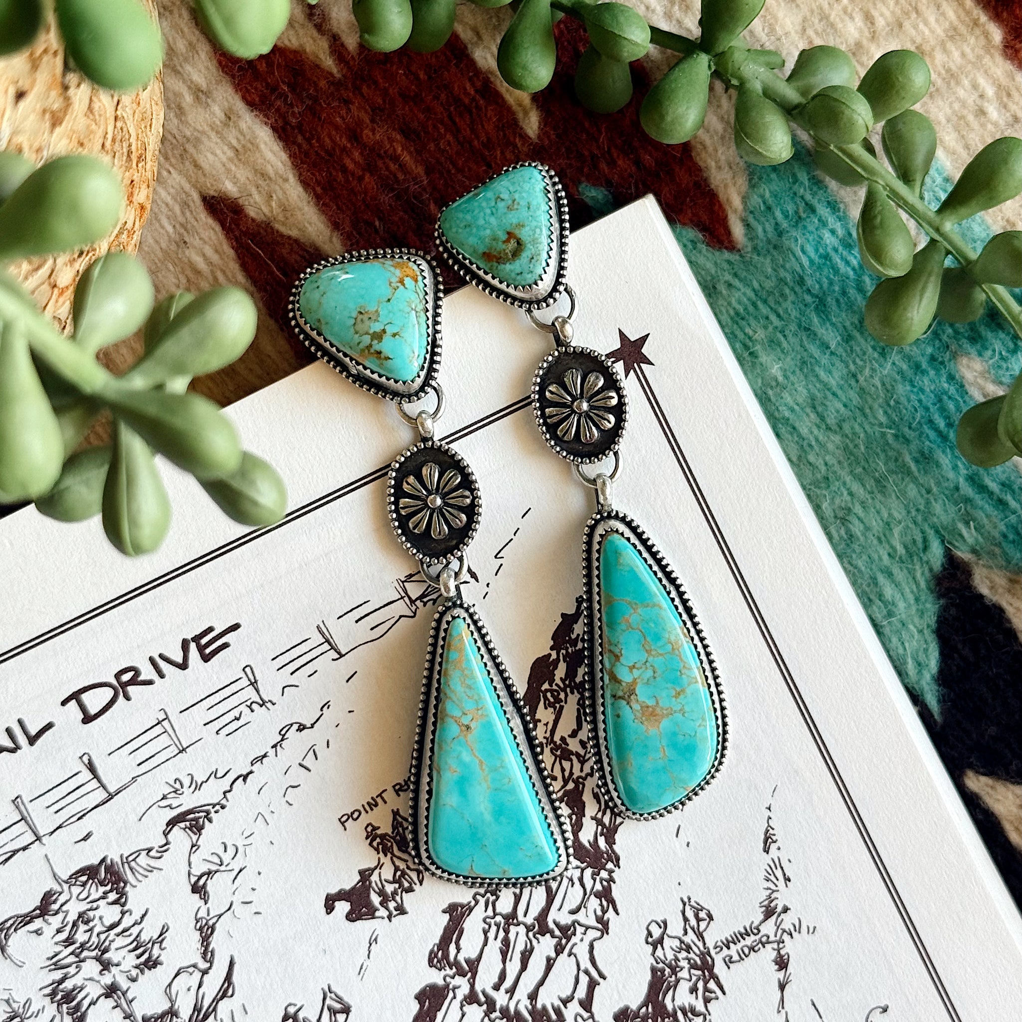 These are one-of-a-kind! These dangle earrings feature tyrone turquoise (bottom) and kingman turquoise (top). They are 3 inches long and do not weigh down your ear. Stamped with my maker's mark C3 .925!