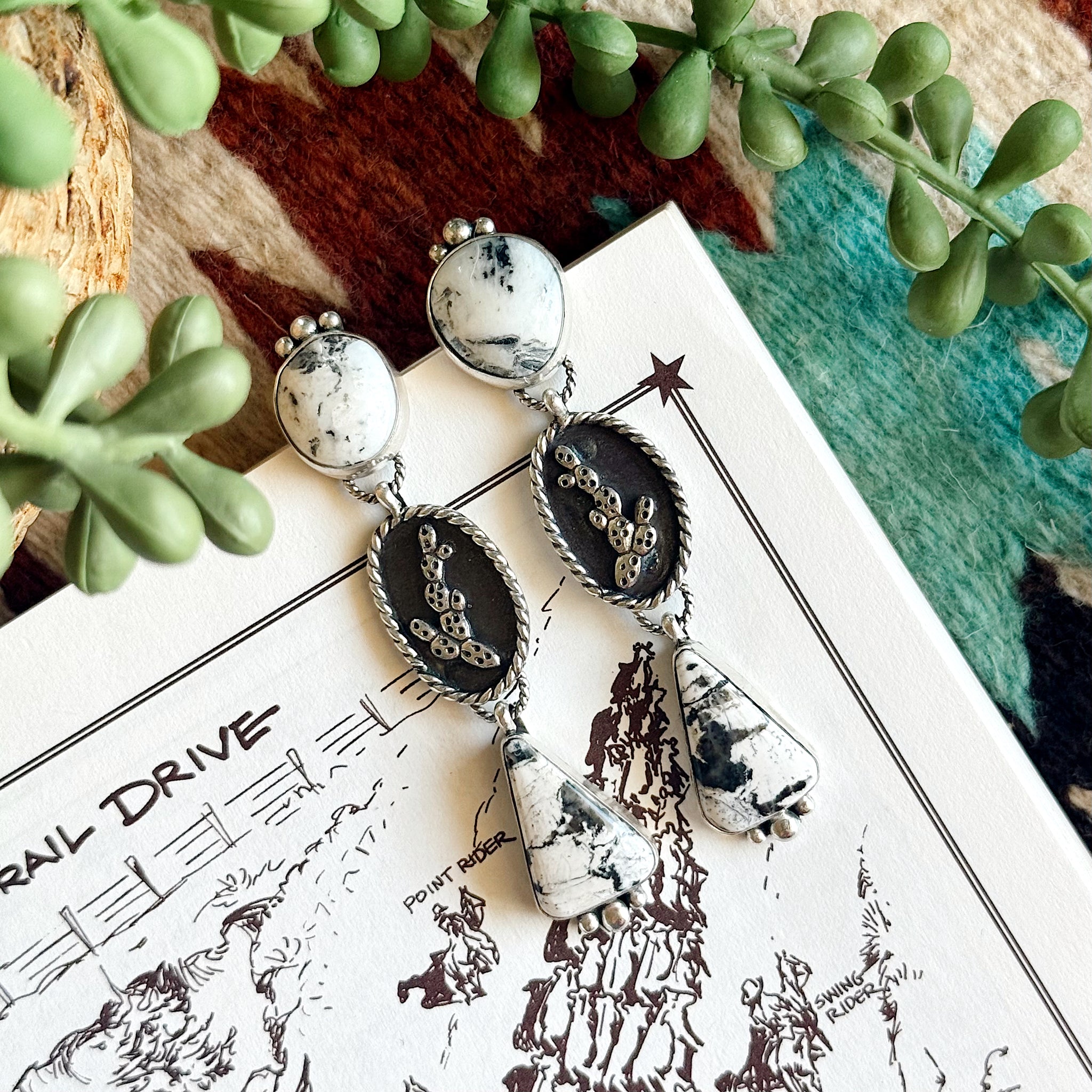 My favorite from the whole collection! These white buffalo dangle earrings featuring cactus castings in the middle are sure to be a show stopper. They are 3 inches long and lightweight. Stamped with my maker's mark C3 .925!